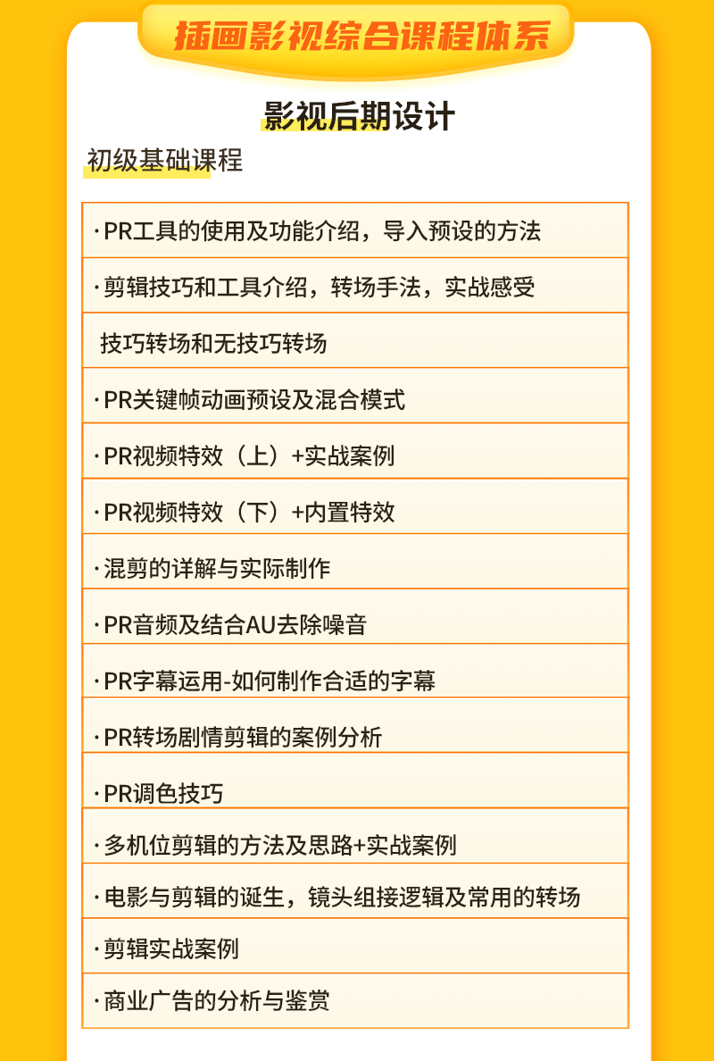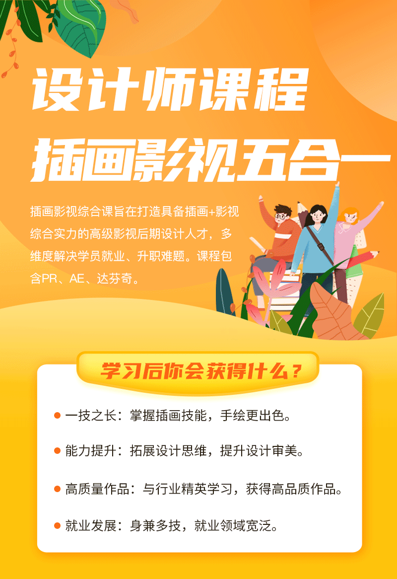 插画影视综合课旨在打造具备插画+影视综合实力的高级影视后期设计人才,多维度解决学员就业、升职难题,当下最火的两个大方向结合训练,让学员掌握三维动画等内容 ,让学员真正具备综合三维设计能力。同时,课程内容涵盖视听编导、短视频、电影级实景合成、专业级影视动画等内容,让学员构建正确的视听理论体系,具备高级后期人才视野和专业能力。
